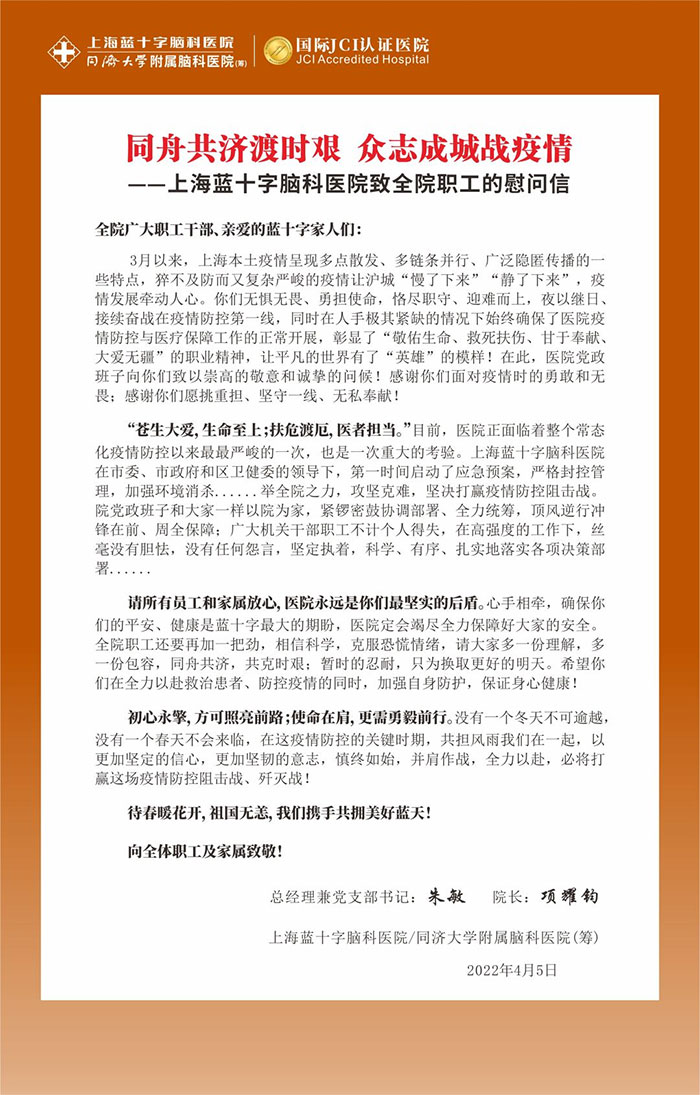 “苍生大爱,生命至上;扶危渡厄,医者担当。”目前,医院正面临着整个常态化疫情防控以来最最严峻的一次,也是一次重大的考验。上海蓝十字脑科医院在市委、市政府和区卫健委的领导下,第一时间启动了应急预案,严格封控管理,加强环境消杀......举全院之力,攻坚克难,坚决打赢疫情防控阻击战。院党政班子和大家一样以院为家,紧锣密鼓协调部署、全力统筹,顶风逆行冲锋在前、周全保障;广大机关干部职工不计个人得失,在高强度的工作下,丝毫没有胆怯,没有任何怨言,坚定执着,科学、有序、扎实地落实各项决策部署......