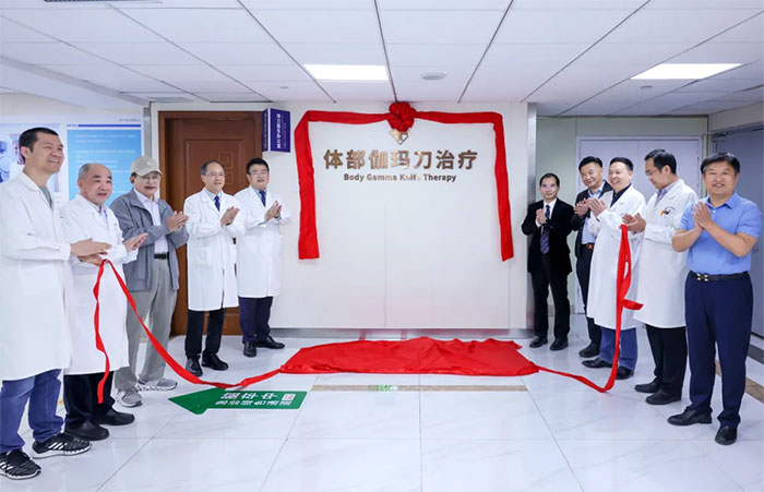 ▲ 专家与院领导共同揭开体部伽玛刀的“红盖头”