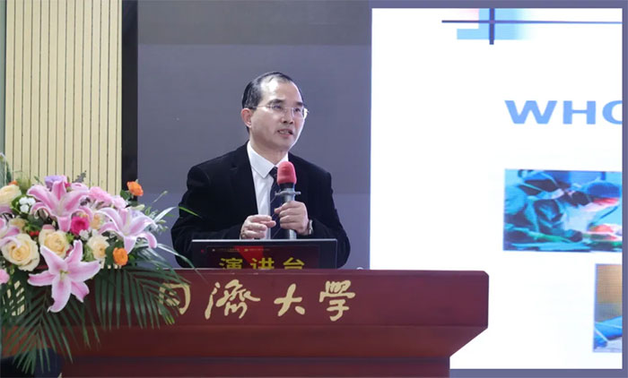 本次讲座特邀白永瑞教授作专题报告。在热烈的掌声中,白永瑞教授上台授课。他祝贺医院体部伽玛刀正式开机,并以“实体恶性肿瘤的立体定向放射治疗体会”为主题,从概述、立体定向放射治疗定义、大分割照射的生物效应、临床应用及疗效等几大方面,详细分享了各种放疗手段的发展和差异,重点介绍了体部伽玛刀的治疗原理、计量学特点、处方剂量要求等。