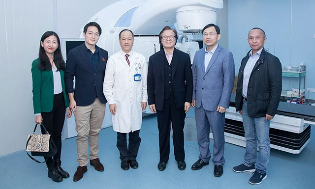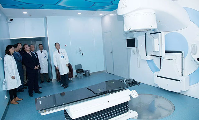 在重点科室中,Mark Wen一行最后参观了精准放疗温馨的诊疗环境,进入机房实地考察了中心最新引进的瑞典医科达Elekta第六代全数字化加速器。精准放疗王晓东主任介绍说,瑞典医科达公司是全球精准放疗的领导者,医院引进的这台设备是当前精准放疗的主流设备,它完全符合以“三精”(精准定位、精准计划、精准治疗)为特征的高能X射线放射治疗新技术的发展,可满足大部分放射治疗技术及高级应用,如三维适形放疗(3DCRT)、调强放疗(IMRT)、容积旋转调强治疗(VMAT)、立体定向放疗(SRT)等。可治疗头颈部肿瘤、胸部肿瘤、腹部肿瘤等全身各部位肿瘤,以及各种转移瘤,治疗精准、预后良好、并发症少,单次治疗时间仅需2-6分钟,可广泛适用于绝大多数肿瘤患者。