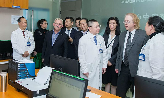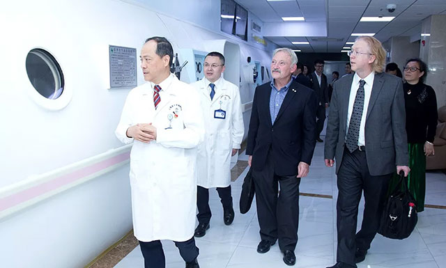 UBC专家团听取了项耀钧院长关于医院发展建设的介绍,并先后参观了医院重症监护病区、神经内科7A病区、美国尼高力视频脑电室、神经康复医学科、高压氧科、影像科、DSA介入科及放疗科,对医院的特色科室和设施设备作重点了解。“Like airbus!”(像空客一样),Max教授在参观高压氧舱群时称赞道。
