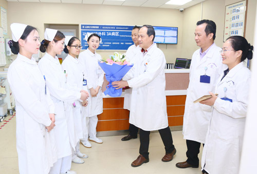 4月25日,在护理部的组织下,项耀钧院长带领医务科科长沈广智、护理部主管护师李京纳来到事发病区。项耀钧院长对当事护士的工作给予了充分的肯定,对她们的遭遇表达了深切的关怀,同时更对她们的坚定和无私给予了高度赞扬。