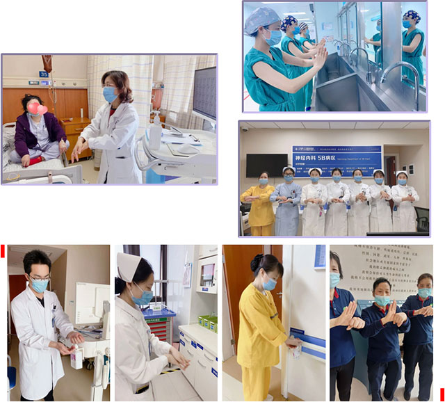 各科室/病区利用早会、查房等时机,组织全员进行“七步洗手法”实操演练,从门诊特需专家、科主任、护士长、临床医护到护工、保洁等,大家纷纷巧妙地通过洗手姿势展示手卫生的操作步骤和注意事项,内容和形式上生动有趣,手卫生基本理念和安全意识渗透至医院的每一个角落,全员更加充分地认识到了建立以患者安全为核心的文化、提倡较佳手卫生行为的重要性。