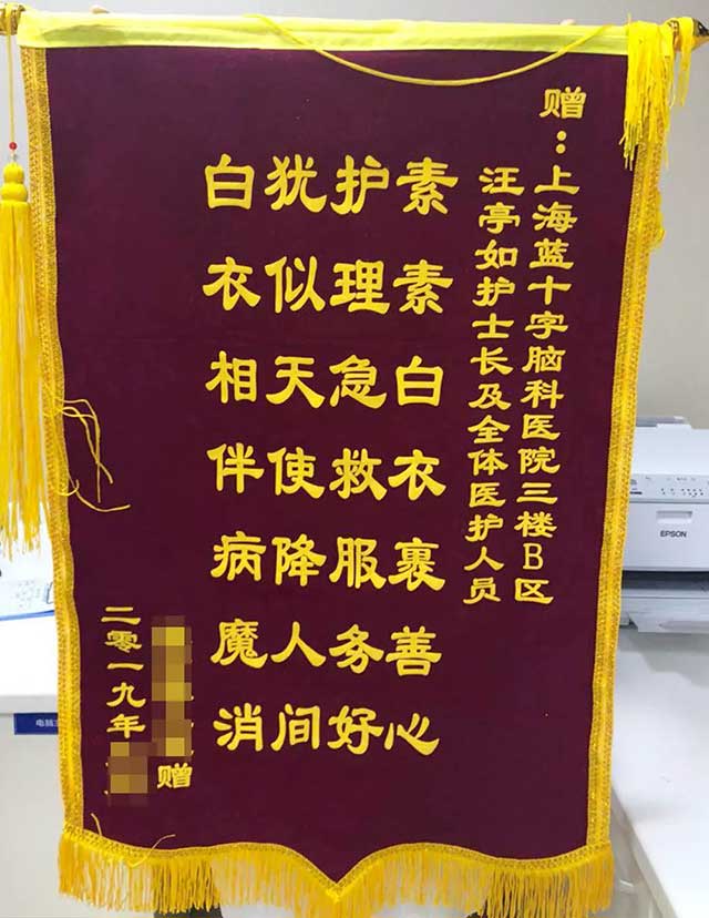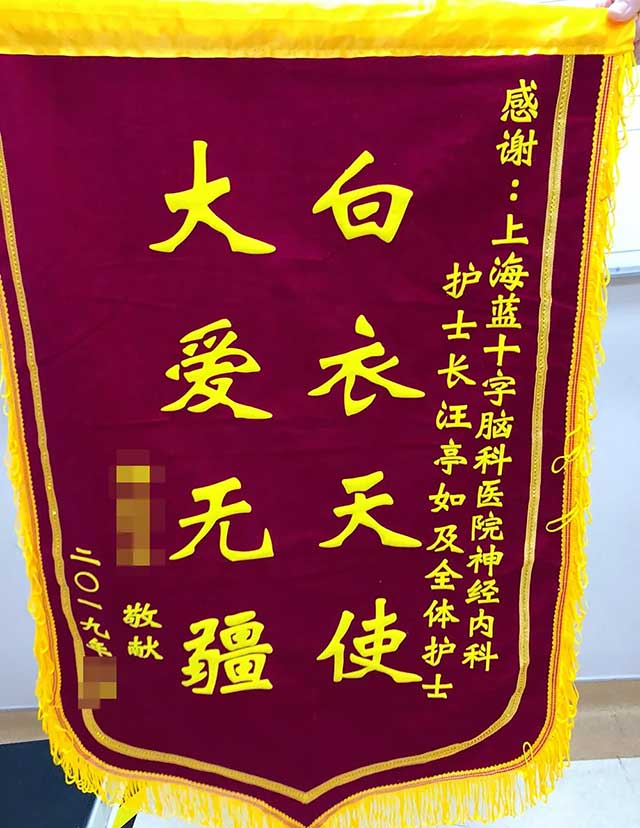 在“五一二”国际护士节来临之际,两面表达患者及家属感动和感谢之情的锦旗,送到了上海蓝十字脑科医院神经内科3B病区护士长汪亭如的手中,这两面锦旗是送给汪亭如及其所带领的护理团队的。“在5.12之前能收到患者感谢的锦旗,这是今年护士节我们收到的最珍贵的礼物了,能得到患者的肯定,看到患者康复,再苦再累都值。”汪亭如说。