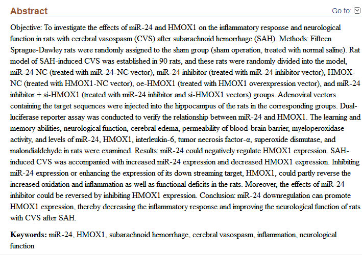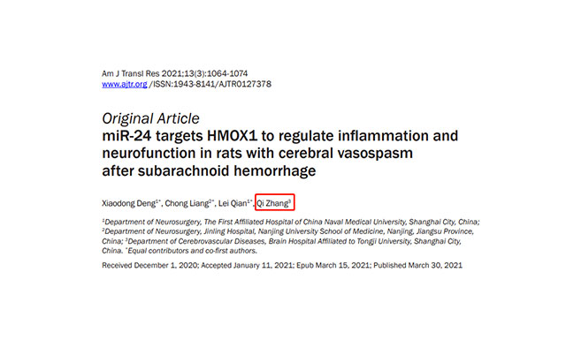此次张琪博士作为通讯作者(课题负责人)在 American Journal of Translational Research发表的《miR-24靶向HMOX1调节蛛网膜下腔出血后脑血管痉挛大鼠炎症和神经功能》文章,旨在探讨miR-24(即microRNA-24,是一类由内源基因编码的长度约为22个核苷酸的非编码单链RNA分子,它们在动植物中参与转录后基因表达调控)和HMOX1(heme oxygenase 1,血红素加氧酶1)对蛛网膜下腔出血(SAH)后脑血管痉挛(CVS)大鼠炎症反应及神经功能的影响。经对大鼠开展科学试验后发现,miR-24下调可促进HMOX1的表达,从而降低SAH后CVS大鼠的炎症反应,改善其神经功能。
