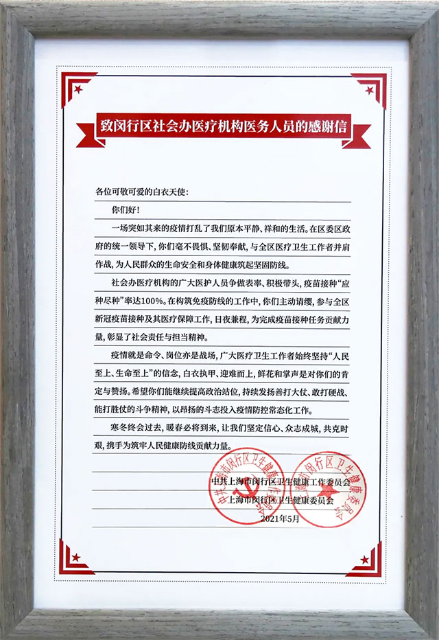 最后,金莉萍副书记向医院递送了闵行区致医务人员的感谢信,感谢医院及医护人员积极参与全区新冠疫苗接种及其医疗保障工作,日夜兼程,为完成疫苗接种任务贡献力量,彰显了社会责任和担当精神。