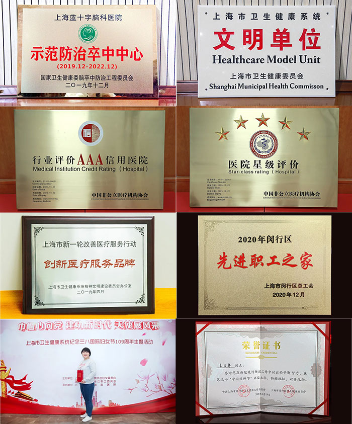 经过多年累积,医院获得国家卫健委脑防委“示范防治卒中中心”、上海市卫生健康系统文明单位、“信用评价AAA级、能力评价五星”医院、首批上海市“创新医疗服务品牌”、“上海市和谐劳动关系达标企业”等荣誉;党支部获得“七宝镇‘十佳’优秀党组织”,工会获得闵行区 “先进职工之家”;神经内科荣获 “2019-2020年度上海市卫生健康行业青年文明号” ,神经内科7A病区护士长李楠楠荣获上海市卫生健康系统“三八红旗手”,神经外科6B病区留德博士吴治群荣获闵行区“防控疫情优秀医师”等。