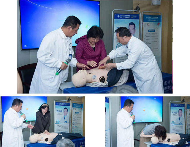 为了使大家熟练掌握心肺复苏操作技能,以备不时之需,急诊科齐洪阁主任和李振并主任密切配合,为大家示范了心肺复苏操作,并手把手现场教学,将正确的急救方法传递给居民。