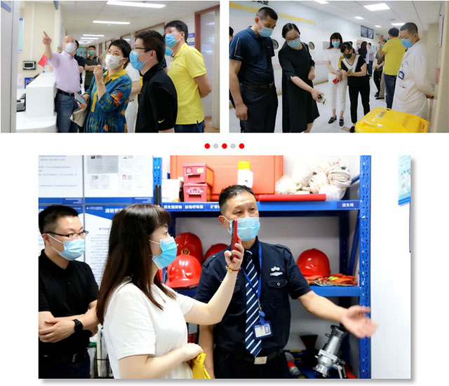 项耀钧院长表示,安全生产必须注重每一个细节问题。因此在参观过程中,每到一处,项院长都会将每个区域的安全防控特色举措和细节把控详细介绍。如,JCI国际患者安全十大目标、危急值报告流程、分级护理制度、患者身份正确识别等流程制度上墙,时刻提醒医务人员按照标准正确操作;每一楼层、每一病区都设有应急报警系统和消防自卫编排任务分配表:报警系统与消控室联动、确保迅速作出反应,消防编组按岗设置,每天晨交班时交接。每年医院都要进行一次全院的消防演习,以便让每位员工都要熟悉消防安全疏散等流程,防范于未然。