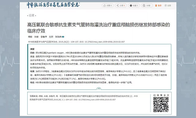 近日,中华系列杂志、国家科技核心期刊 《中华航海医学与高气压医学杂志》 最新一期(2019年4月)刊登了一篇题为《高压氧联合敏感抗生素支气管肺泡灌洗治疗重症颅脑损伤继发肺部感染的临床疗效》论文。