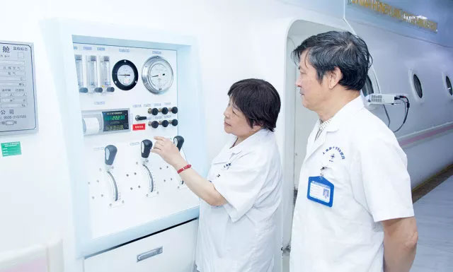 ▲ 治疗间期,张陆弟教授查看高压氧舱