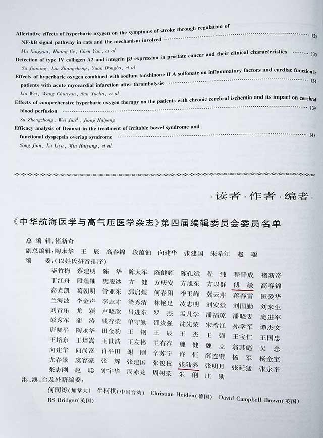 《中华航海医学与高气压医学杂志》是我国航海医学、高压氧医学、潜水医学领域唯一的中文核心期刊、中国科技论文统计源期刊(CSCD核心和科技核心期刊双核心期刊),华东地区优秀期刊。被美国《化学文摘》(CA)、俄罗斯《文摘杂志》(AJ)、《中文核心期刊要目总览》等数据库收录,多次获中华医学会优秀期刊奖。值得一提的是,上海蓝十字脑科医院张陆弟教授(连续四届)为《中华航海医学与高气压医学杂志》编辑委员会编委。据了解,一家医院同时有两位专家出现在编委名单中,这种情况十分罕见。