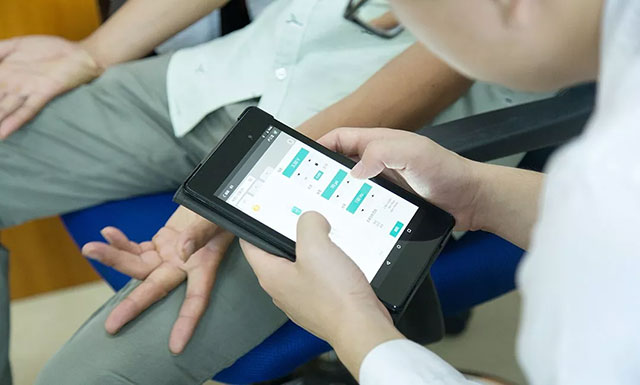 ▲ 工程师为患者进行DBS开机,并调试刺激参数