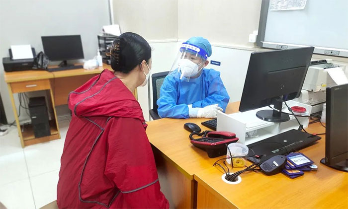 进入门诊大厅,工作人员在入口为每一位前来就诊的居民测温、流调、预检、分诊,严把防疫关口。