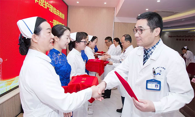 在受聘仪式上,项耀钧院长等院领导为65名护理人员颁发了聘书,希望受聘人员珍惜荣誉,再接再厉,努力奋进,并号召全体护士学习她们教书育人的职业精神、严谨细致的工作作风、和谐互助的同事友情,娴熟扎实的业务技能。