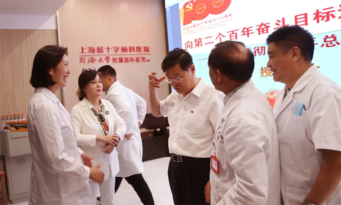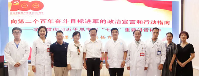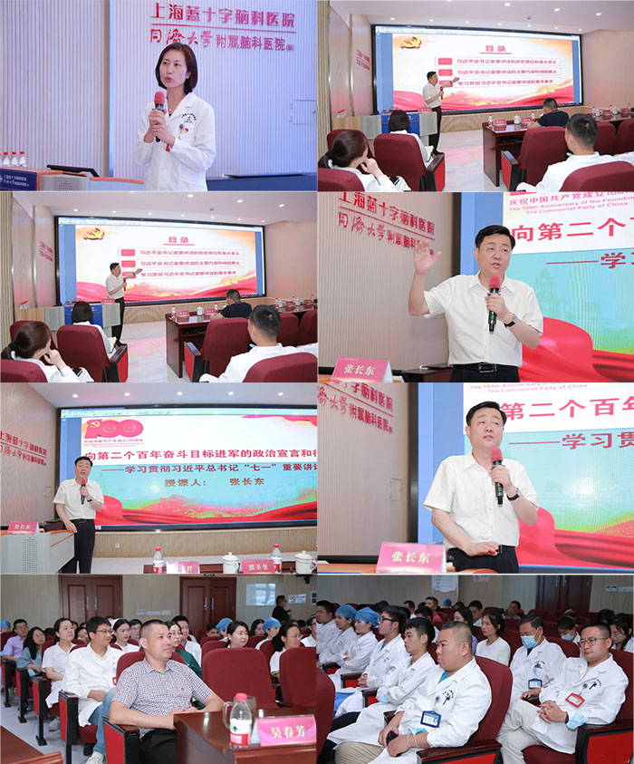 一百年前的今日——1921年7月23日——是中国共产党第一次全国代表大会在上海召开的日子。2021年7月21日下午,上海蓝十字脑科医院掀起学习热潮,特邀武警上海市总队原副政委、原武警上海指挥学院院长、副教授,上海市现代领导进修学院教授张长东莅临授课,主题为《向第二个百年奋斗目标进军的政治宣言和行动指南——学习贯彻习近平总书记“七一”重要讲话精神》。朱敏书记与全体党员、入党积极分子、共青团员、及各科室医护骨干仔细聆听,参加公司庆祝建党百年文艺汇演的部分演职人员也到场聆听,该主题活动由郭俊艳副院长主持。