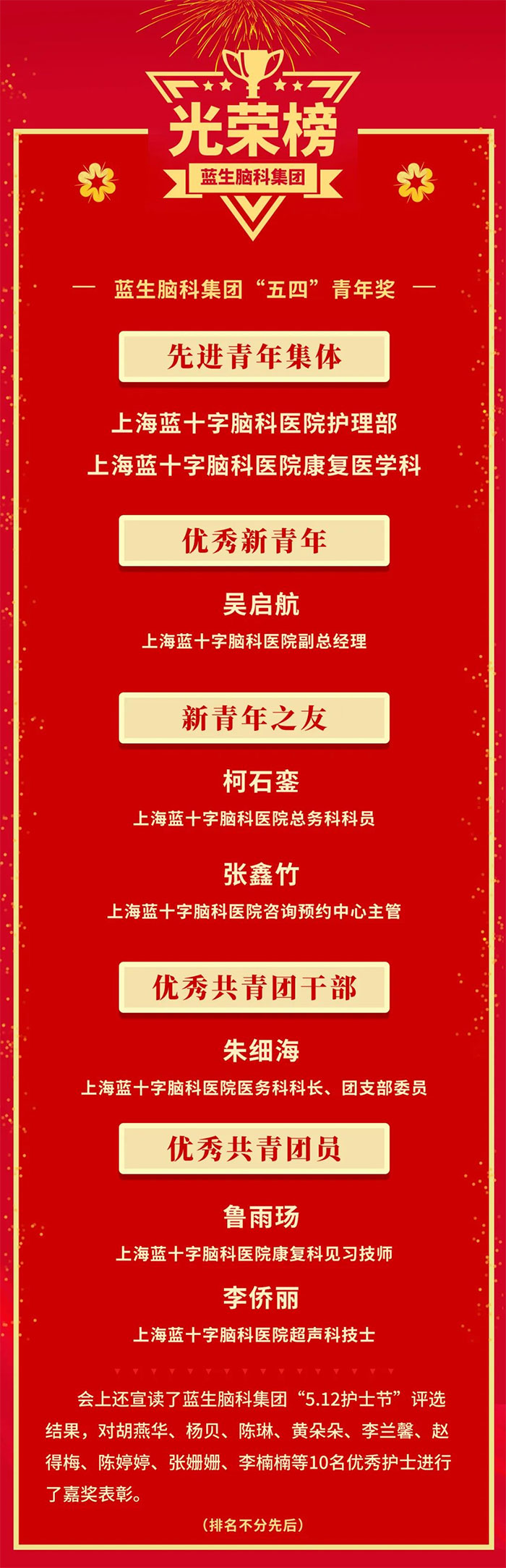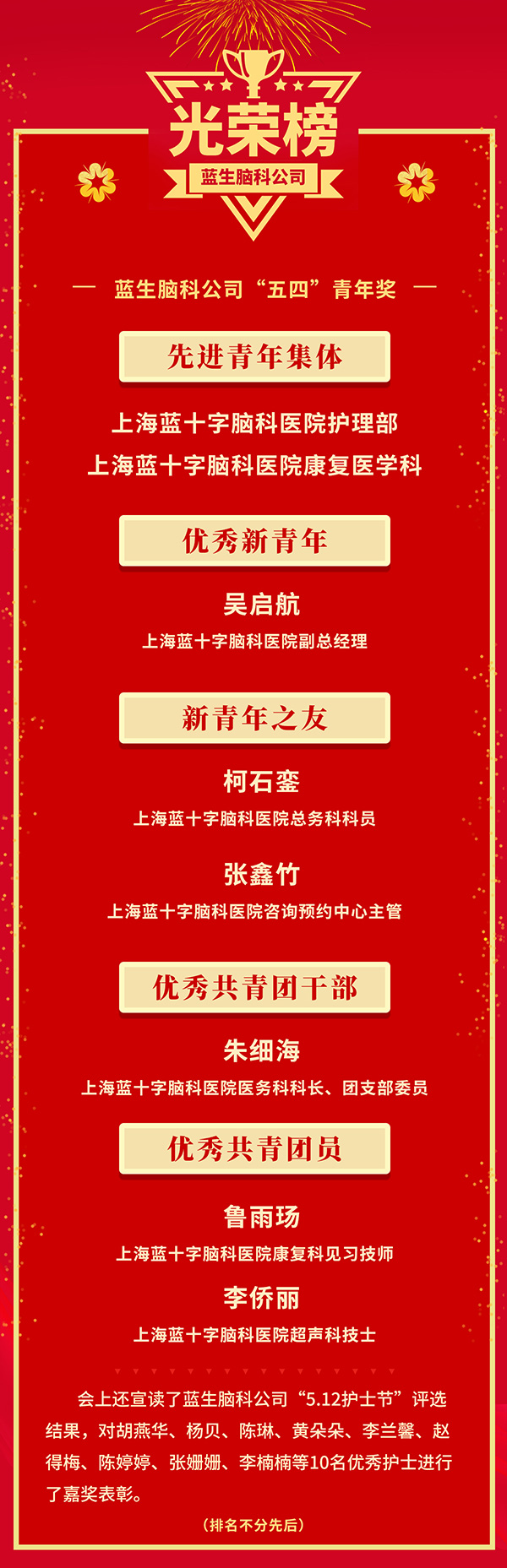 上海蓝十字脑科医院喜获多项先进集体和优秀个人荣誉表彰。自立院以来,医院始终坚持以习近平新时代中国特色社会主义思想为指导,坚持党建统领促发展,工团联动齐发力的工作新格局,切实提高政治站位,真正将党建优势转化为创新优势、竞争优势和发展优势,形成推动医院高质量发展的强大合力,为公司品牌化、连锁化发展注入“新势能”。