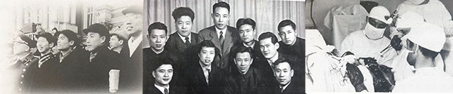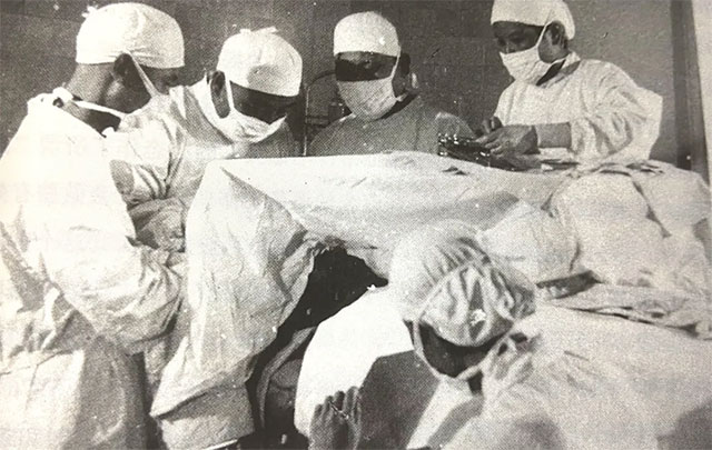 ▲ 1965年11月首创针麻开颅,此为1973年人民画报社所摄陈公白(左二)主持此类手术