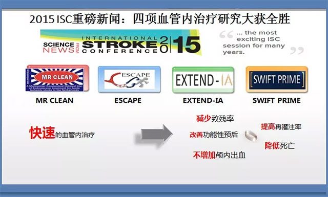 2015年国际卒中大会上,四项血管内治疗研究(MR CLEAN研究、ESCAPE研究、EXTEND-IA研究、SWIFT PRIME研究)已扩大了治疗时间窗。这些研究表明,在具备影像学评价存在组织窗的前提下,血管内治疗可取得良好的临床获益,可显著提高再灌注率、减少致残率及死亡率、改善功能性预后,且不增加颅内出血。