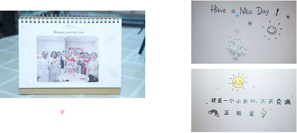 有的值班室富有人文气息,洋溢着和谐团结的旋律。用照片做成的画册,特别定制的生日台历,相互勉励的话语,愿带给你好梦的捕梦网...因为遇见你们,而更期待每一个黎明的到来,不惧怕每一个夜幕降临。我们相信,未来不是梦,我们可以拥有更加精彩的人生。