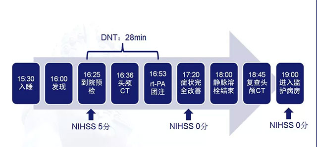 最近,医院卒中绿色通道收治了一位67岁的女性脑卒中患者。患者从入院预检到进行rt-PA团注(静脉溶栓),耗时仅为28分钟,即DNT:28min。经治疗,患者的NIHSS评分[1]从入院时的5分降至0分,转危为安。