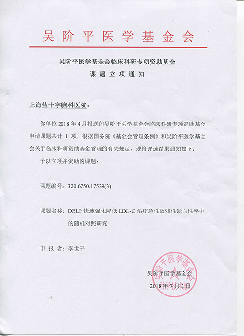 近日,上海蓝十字脑科医院一项题为《DELP快速强化降低LDL-C治疗急性致残性缺血性卒中的随机对照研究》的国家重大科研项目,喜获吴阶平医学基金会临床科研专项资助基金课题立项。课题由我院神经内科专家李世平教授担任负责人,主要对48小时内的脑缺血患者进行血液净化治疗,对降低致残致死率,提高患者救活率和生存质量有着非常重要的意义。