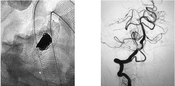 在充分准备后,张琪博士在刘春医生、周林华医生协助下为患者进行了支架辅助动脉瘤栓塞手术。填入弹簧圈后,再置入支架,完全释放后,造影显示动脉瘤无显影,支架覆盖良好,载瘤动脉通畅,撤出微导管输送系统,复查双侧椎动脉造影显示远端血流通畅。