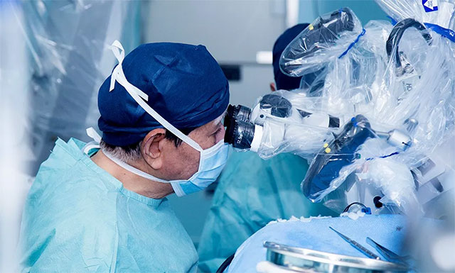 ▲ 通过蔡司显微镜(双荧光),沈建康教授实施手术