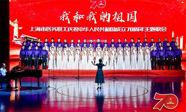 9月18日,由上海市卫生健康委、上海市卫生健康系统精神文明委、上海市医务工会联合举办的“我和我的祖国——上海市医务职工庆祝中华人民共和国成立70周年主题歌会”在上海市儿童艺术剧场隆重举行。这是市卫生健康系统全行业职工的一次大聚会,千余名医务工作者汇聚一堂,用歌声为伟大祖国70周年华诞送上深情的歌颂和美好的祝福。