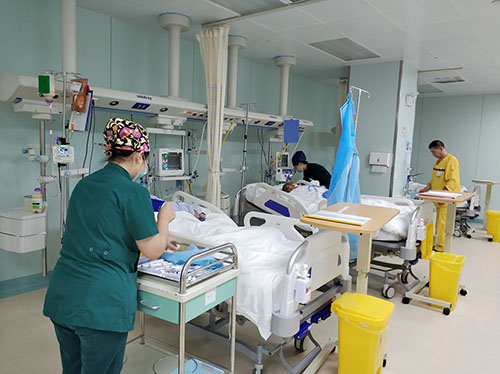 在ICU,生死博弈时刻都在进行。经常有其他医院的危重病人转送到这里接受治疗。有一位患者脑出血加肺部感染,转过来时,呼吸衰竭,重度昏迷,生命垂危,GCS评分只有3分(GCS评分,指的是格拉斯哥昏迷指数的评估,轻度昏迷:12分到14分;中度昏迷:9分到11分;重度昏迷:3分到8分)。ICU团队迅速行动,针对其病情制定医疗方案进行抢救,并予以化痰、护胃、抗感染、高压氧等一系列康复治疗。经过一个多月的精心治疗护理,该患者逐渐清醒,最终康复出院。
