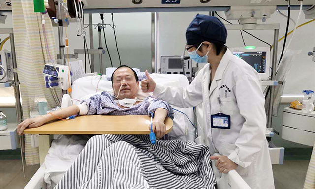 ▲ 患者恢复“自主呼吸”,李鲁萍竖起大拇指