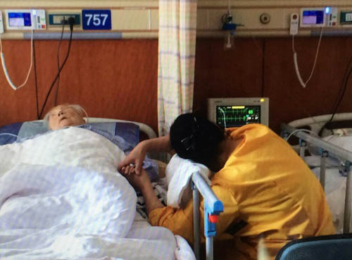 为了患者安全,护工于三只能紧握老人的手,靠着床沿休息