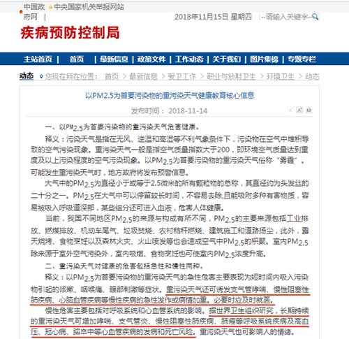 近期,今冬首波重污染天气袭击了我国京津冀及周边地区。国家卫生健康委员会11月14日在官网发布《以PM2.5为首要污染物的重污染天气健康教育核心信息》。核心信息显示,据世界卫生组织研究,长期持续的重污染天气可增加哮喘、支气管炎、慢性阻塞性肺疾病、肺癌等呼吸系统疾病及高血压、冠心病、脑卒中等心血管疾病的发病和死亡风险。