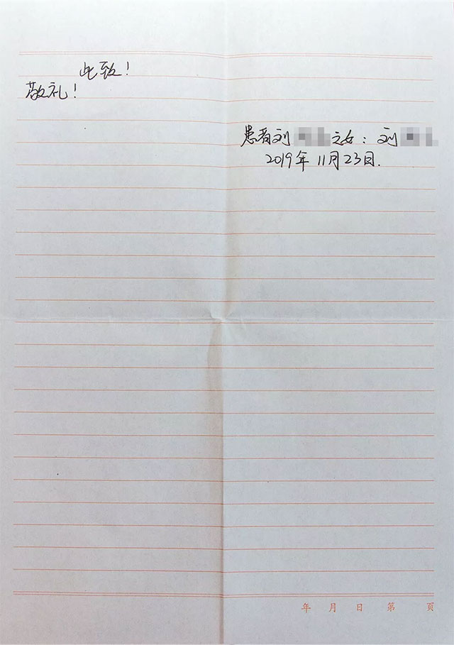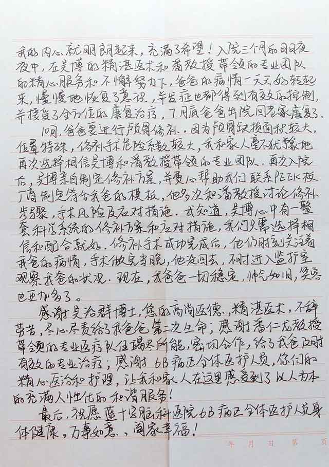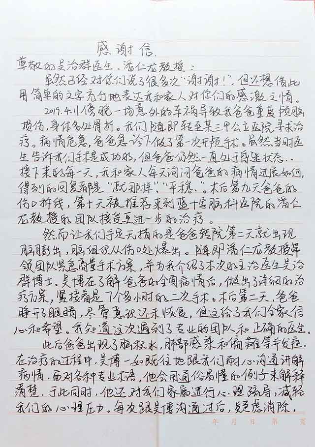 患者脑外伤严重,多次面临生命的危险,但每一次患者都在医护团队专业治疗与精心护理下转危为安,患者及其家属因此非常感动,尤其是患者女儿,她亲历了父亲治疗的整个过程。为了表示感谢,患者女儿给6B病区医护团队送来了两面锦旗,而这次颅骨修补手术后,她更是写了两页满满的感谢信,每一字、每一句、每一段,诉说这感动与真情。(现附感谢信原文)感谢信