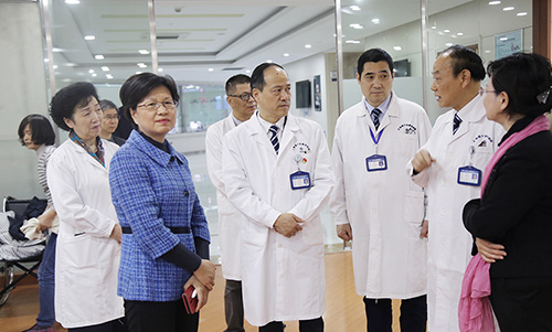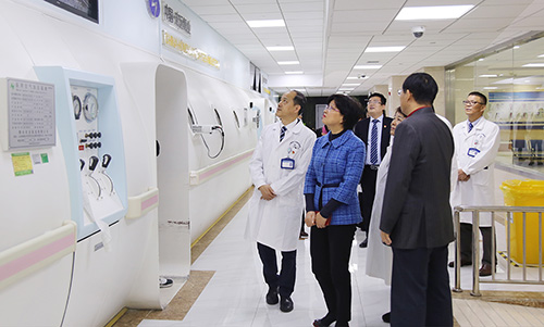 黄红书记一行首先在十楼观看了3D手术视频、参观了党建墙,随后深入ICU重症监护病区、脑血管病区、美国尼高力视频脑电监测、神经康复医学科以及高压氧科、医学影像科等重点特色科室了解情况、亲切交谈、关心发展。医院规范的布局、舒适的环境,以质量和安全为核心的国际JCI先进理念,医康联合一体化专业服务模式,与公立医疗优势互补、错位发展的高端脑科战略定位等得到黄书记的肯定。