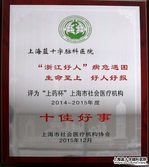 2015年12月19日,上海市社会医疗机构协会二届二次会员代表大会暨第五届管理年会在上海交通大学医学院懿德楼会议厅隆重召开。会上,上海蓝十字脑科医院“‘浙江好人’病危遇困生命至上好人好报”荣获“上药杯”上海市社会医疗机构2014--2015年度“十佳好事”称号。