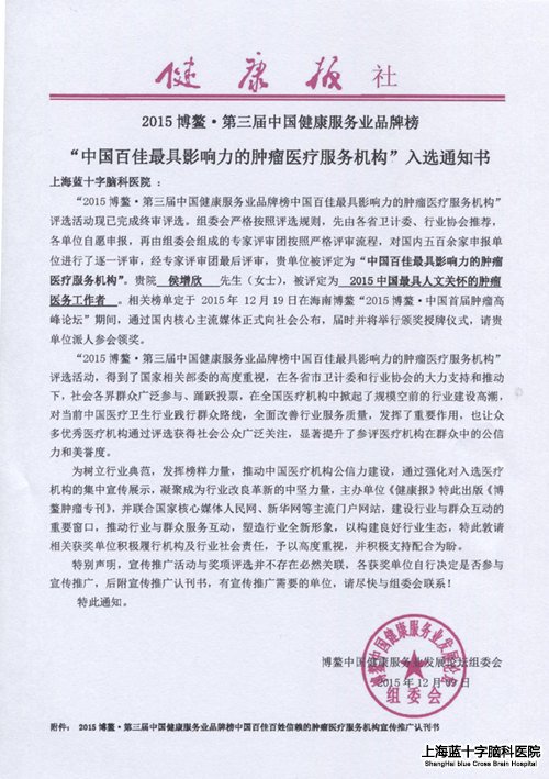 本次肿瘤高峰论坛同时进行了“中国百具影响力的肿瘤医疗服务机构”评选活动。评选活动得到了国家相关部委的高度重视,在各省市卫计委和行业协会的大 力支持和推动下,社会各界群众广泛参与、踊跃投票,在全国医疗机构中掀起了规模空前的行业建设高潮,共有来自全国五百多家医疗单位参加申报工作,盛况空 前。本次评选活动按照严格的评选规则和流程,由各省卫计委、行业协会推荐,组委会专家评审团对申报单位进行了逐一评审。经过层层筛选,在全国范围内评选, 蓝十字脑科医院凭借精湛的技术、优质的服务,高成功率开展“脑肿瘤神经外科手术”在500余家申报单位中以绝对优势脱颖而出,获得“中国百具影响力肿 瘤医疗机构”荣誉,其中北京大学肿瘤医院、广州医科大学附属肿瘤医院、复旦大学附属肿瘤医院等享誉中外的三甲医院也获此殊荣。同时,我院政府特殊津贴神 经外科主任侯增欣教授凭借卓著的医疗成就获得“具人文关怀好医生”荣誉称号。