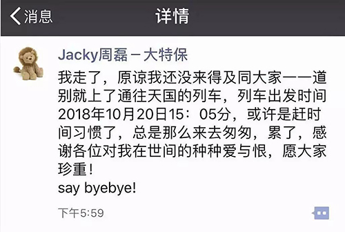 “我走了,原谅我还没来得及同大家一一道别就上了通往天国的列车,列车出发时间2018年10月20日15:05分,或许是赶时间习惯了,总是那么来去匆匆,累了,感谢各位对我在世间的种种爱与恨,愿大家珍重!say byebye!”