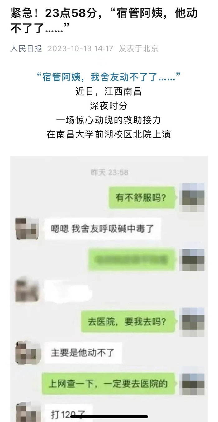 《人民日报》微信公众号10月13日报道,10月3日深夜,南昌大学前湖北院物业中心楼栋的管理员徐剑接到学生小李发来的微信求助。李同学表示,他的室友杨同学在寝室内突发呼吸性碱中毒,人已无法动弹。徐剑赶到现场,学生的手指已经僵直,姿势呈鸡爪状,脸色苍白、呼吸急促,手脚摸起来也是冰凉的。