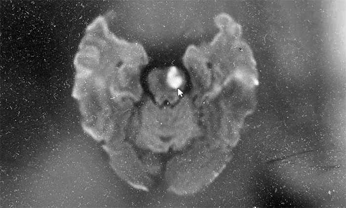 ▲ 磁共振检查示:脑干新发梗塞,偏急性期
