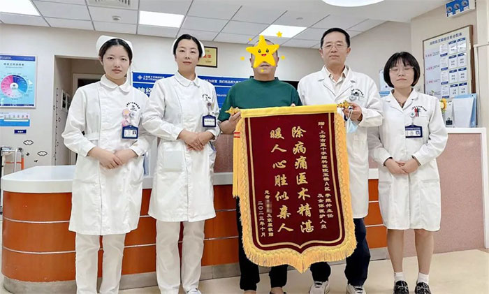 出院时,王先生已行动自如,回归正常生活。他亲手将一面“除病痛医术精湛 暖人心胜似亲人”的锦旗,交到李振并主任和李兰馨护士长手中,表达诚挚的谢意。