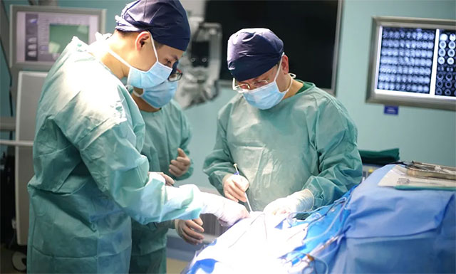 再告知家属手术风险、可能预后并得到其支持后,随后于下午6:00多,潘仁龙主任、吴治群博士组成的手术团队及时为小文进行了手术:颅内血肿清除术 + 颅内压监护探头置入术 + 去骨瓣减压术,经过吴博士和医护人员3个多小时的努力与协作,最终手术顺利完成。