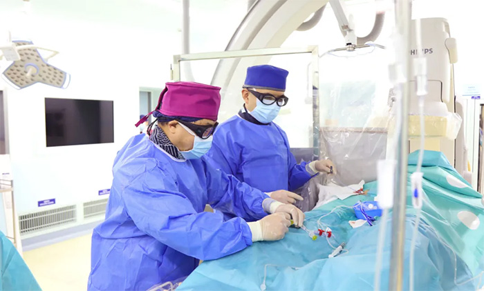 ▲ 4A脑血管病一科主任席刚明教授、4A脑血管病一科副主任王贵平博士在为患者手术