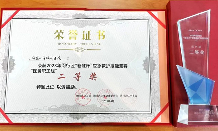 4月21日下午,闵行区举办了“关爱生命·‘救’在身边”——2023年“新虹杯”应急救护技能竞赛。经过激烈角逐,上海蓝十字脑科医院选派的参赛队从30支决赛队伍中脱颖而出,获得二等奖的好成绩。