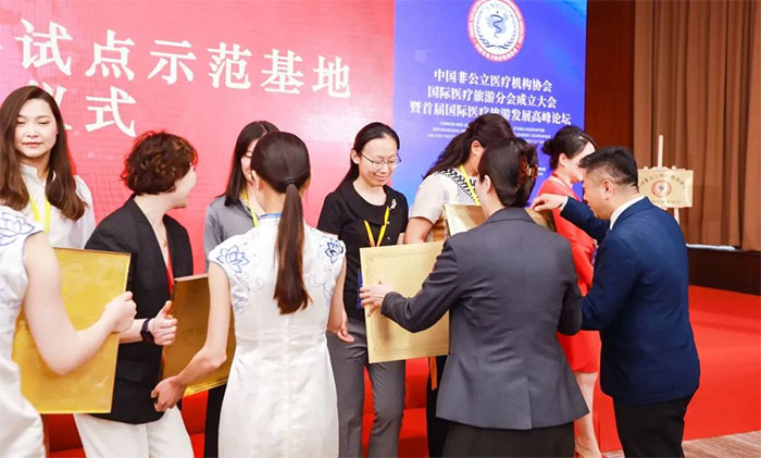 5月30日,中国非公立医疗机构协会国际医疗旅游分会成立大会暨首届国际医疗旅游发展高峰论坛在上海虹桥国家会展中心隆重召开。协会常务副会长兼秘书长郝德明,上海市医学会会长邬惊雷等有关领导,来自海内外国际医疗旅游相关产业领域的代表、教授专家、负责人等近200名嘉宾欢聚一堂,共襄盛会。会上,为国际医疗旅游试点示范基地和培育基地进行了授牌。上海蓝十字脑科医院党支部副书记赵宇兰代表医院上台接受牌匾,并被聘任为协会国际医疗旅游分会第一届委员会委员。
