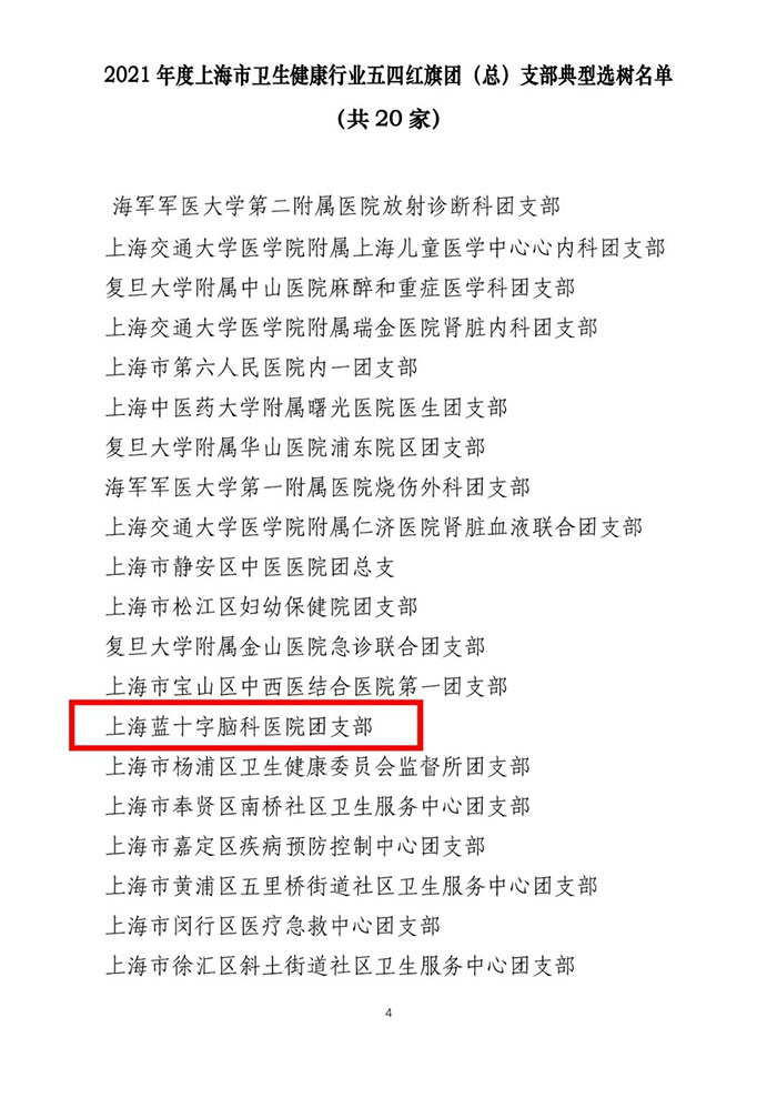 11月10日,市卫生健康委团委通报表扬2021年度上海市卫生健康行业五四红旗团组织、优秀团员、优秀团干部、青年五四奖章典型选树个人和集体。上海蓝十字脑科医院团支部荣获“2021年度上海市卫生健康行业五四红旗团(总)支部”称号。