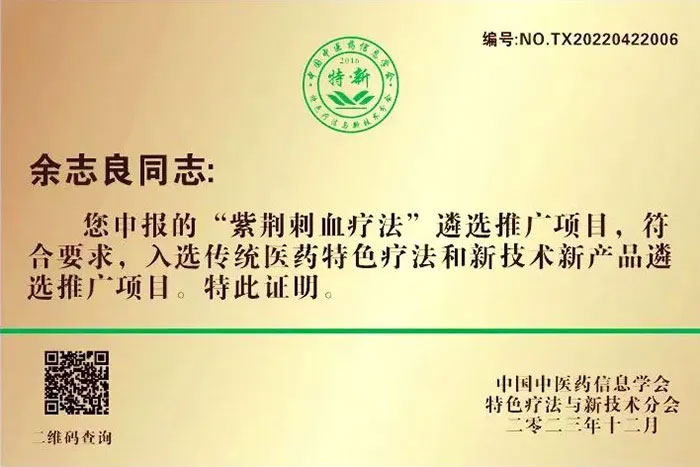 2023年12月,“紫荆刺血疗法”入选了中国中医药信息学会特色疗法与新技术分会传统医药特色疗法和新技术新产品遴选推广项目。