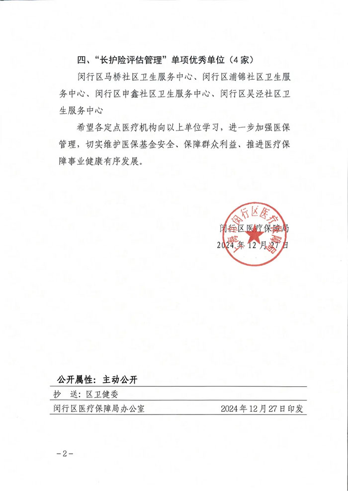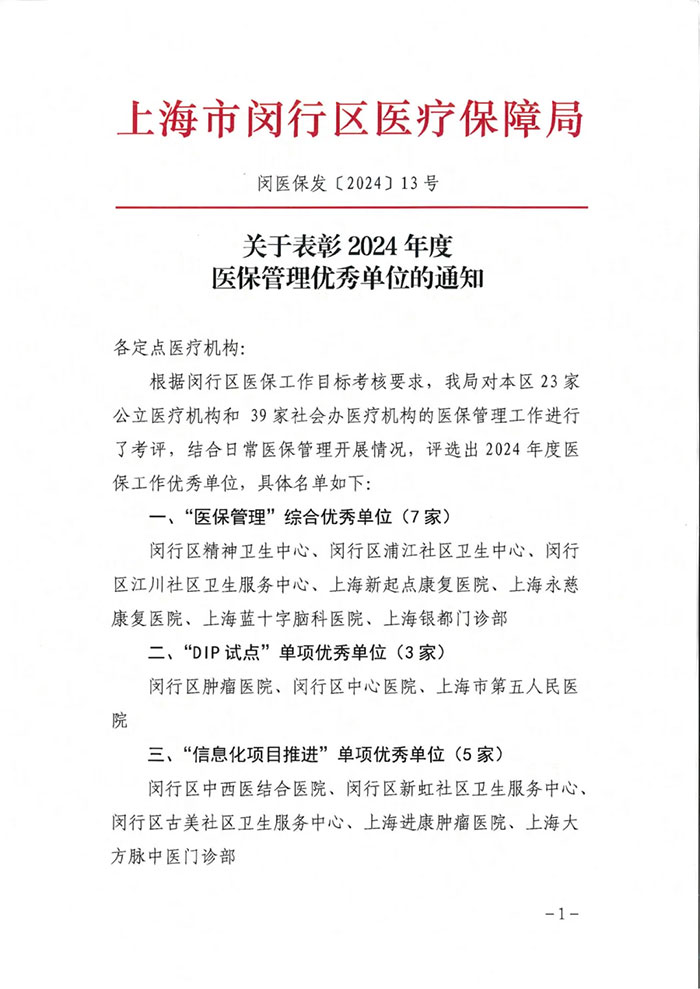 根据闵行区医疗保障局《关于表彰 2024年度医保管理优秀单位的通知》(闵医保发【2024】13号),区医保局根据医保工作目标考核要求,对闵行区23家公立医疗机构和39家社会办医疗机构的医保管理工作进行了考评,结合日常医保管理开展情况,最终评选出2024年度医保工作优秀单位。