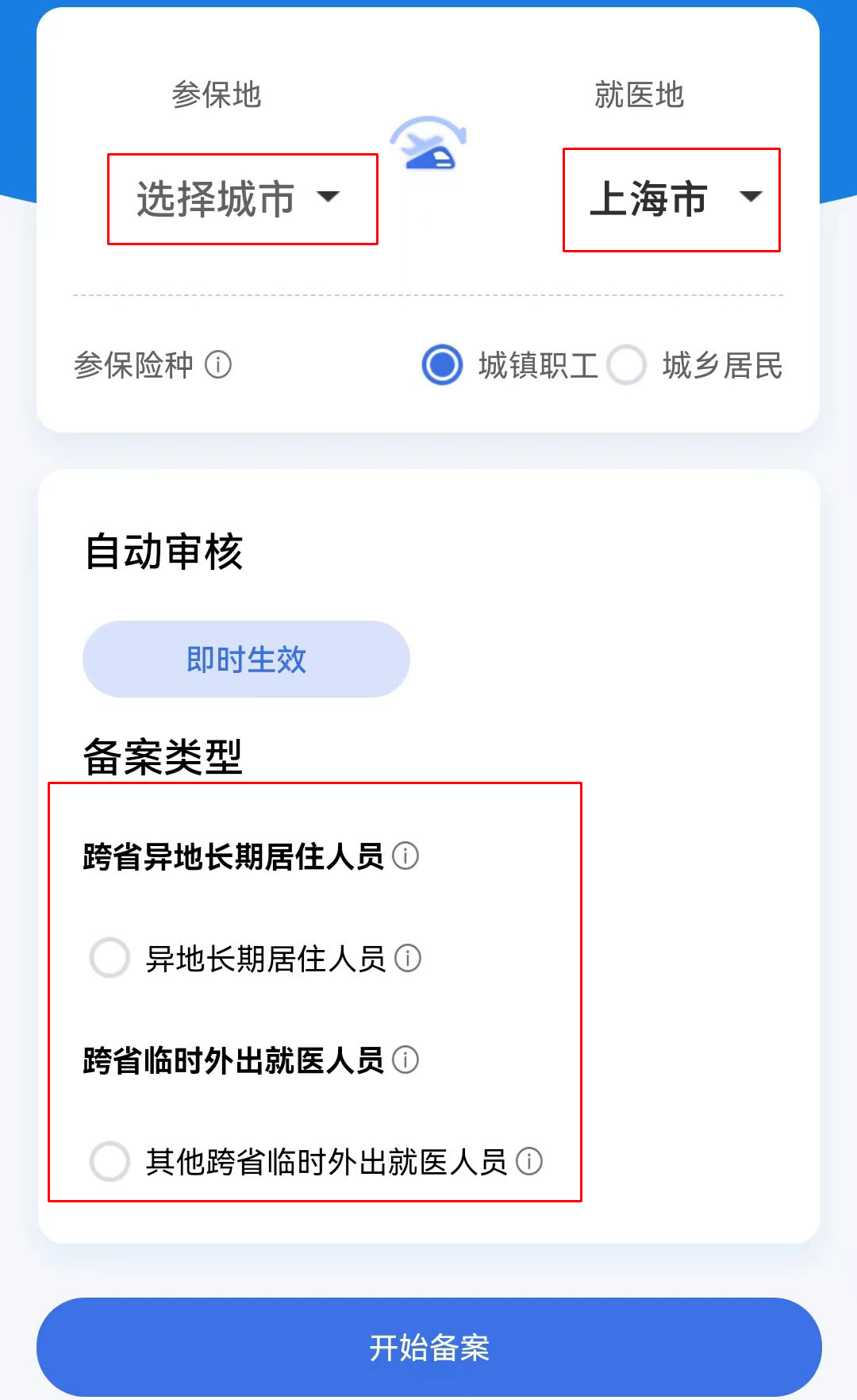 第四步:选择参保地、就医地等信息,完成申请