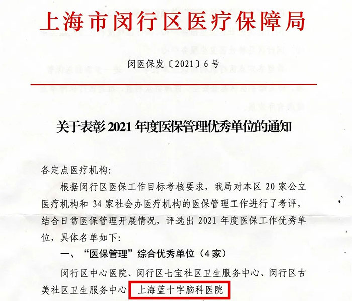 也正因如此,2021年上海蓝十字脑科医院被闵行区医疗保障局评为年度“医保管理”综合优秀单位,成为日常医保管理工作的模范和榜样。